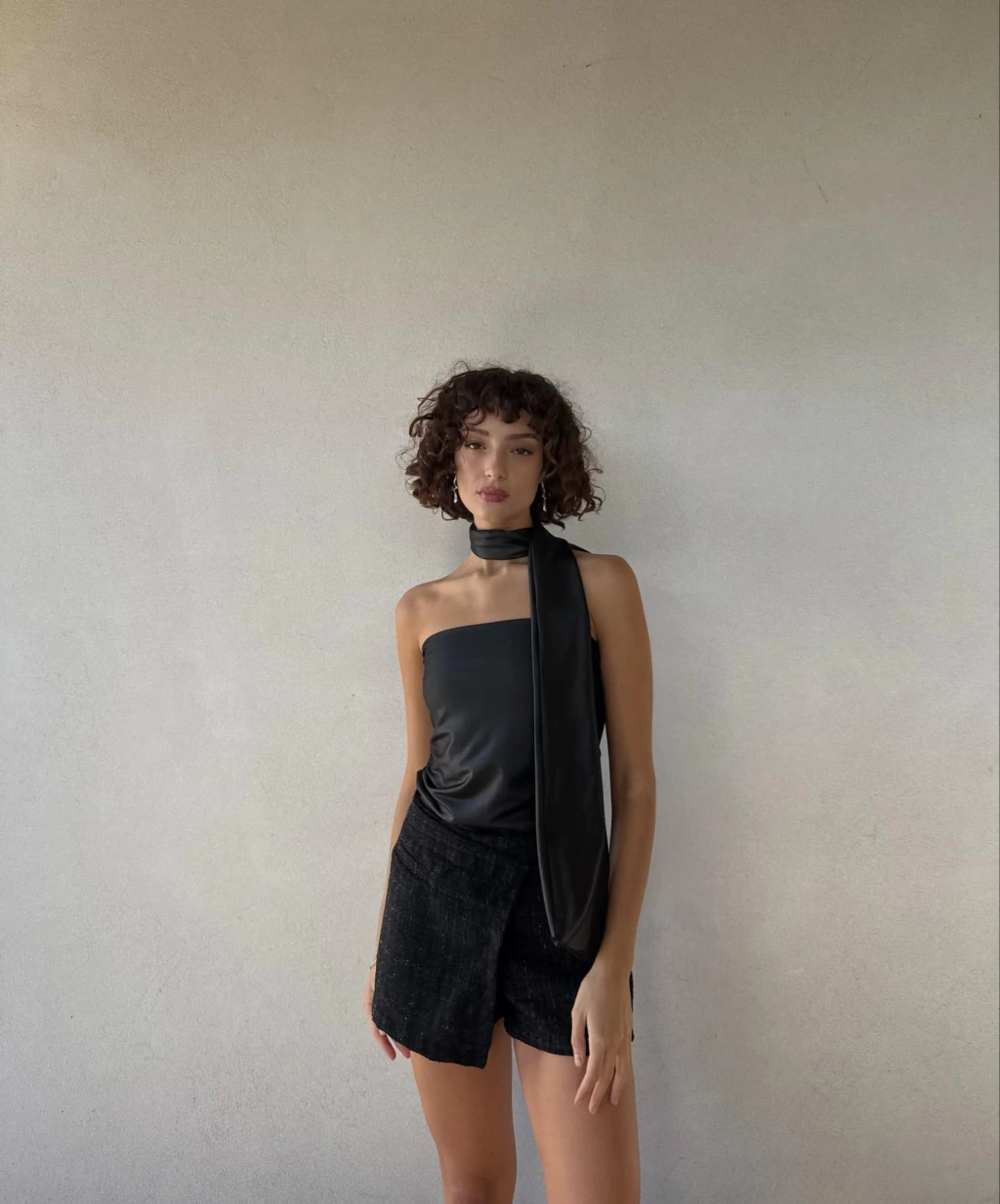 Top engomado strapless con lazo para usar de corbatin, talle unico